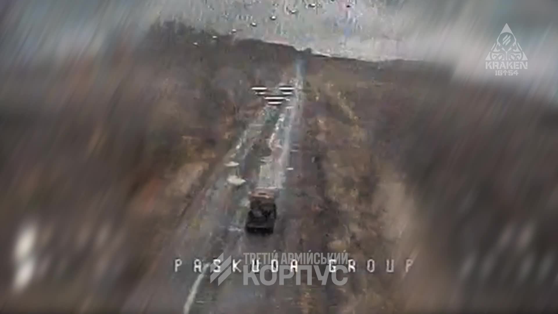 Ukrainian forces from the Third Army Corps struck a column of Russian equipment using FPV drones, hitting targets at close range. Several armored vehicles, a truck towing an artillery piece, civilian vehicles and a motorcycle were destroyed.