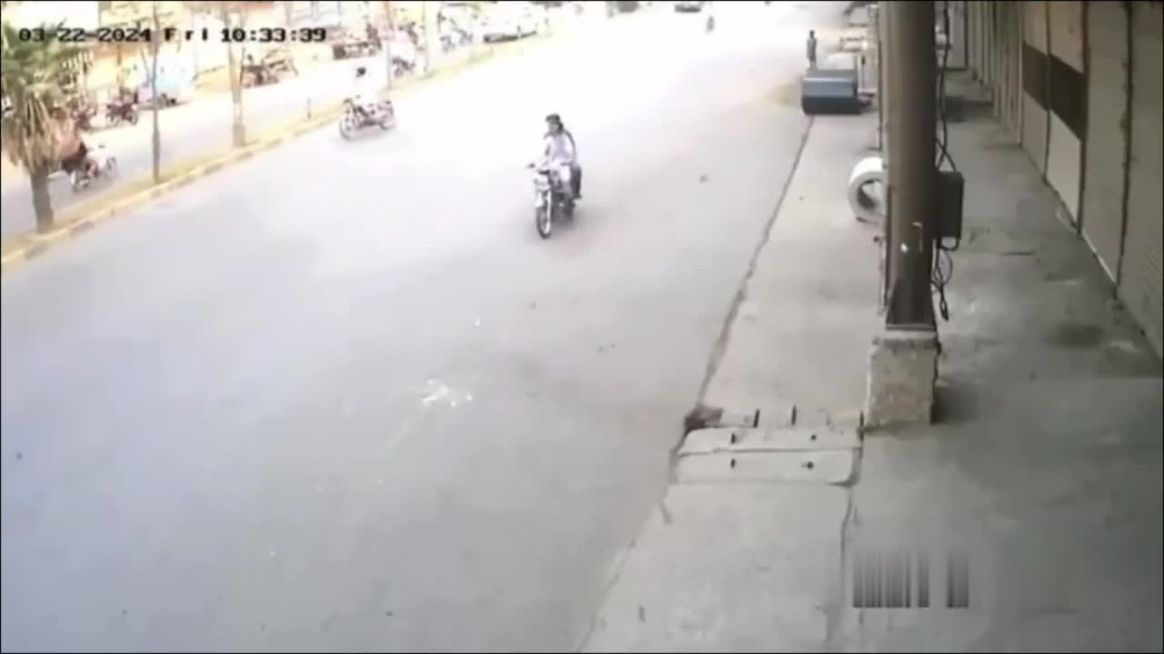 Pakistan - Man on a motorbike is slashed on his throat (?) with the metal string of a fighting kite that had been left on the street.